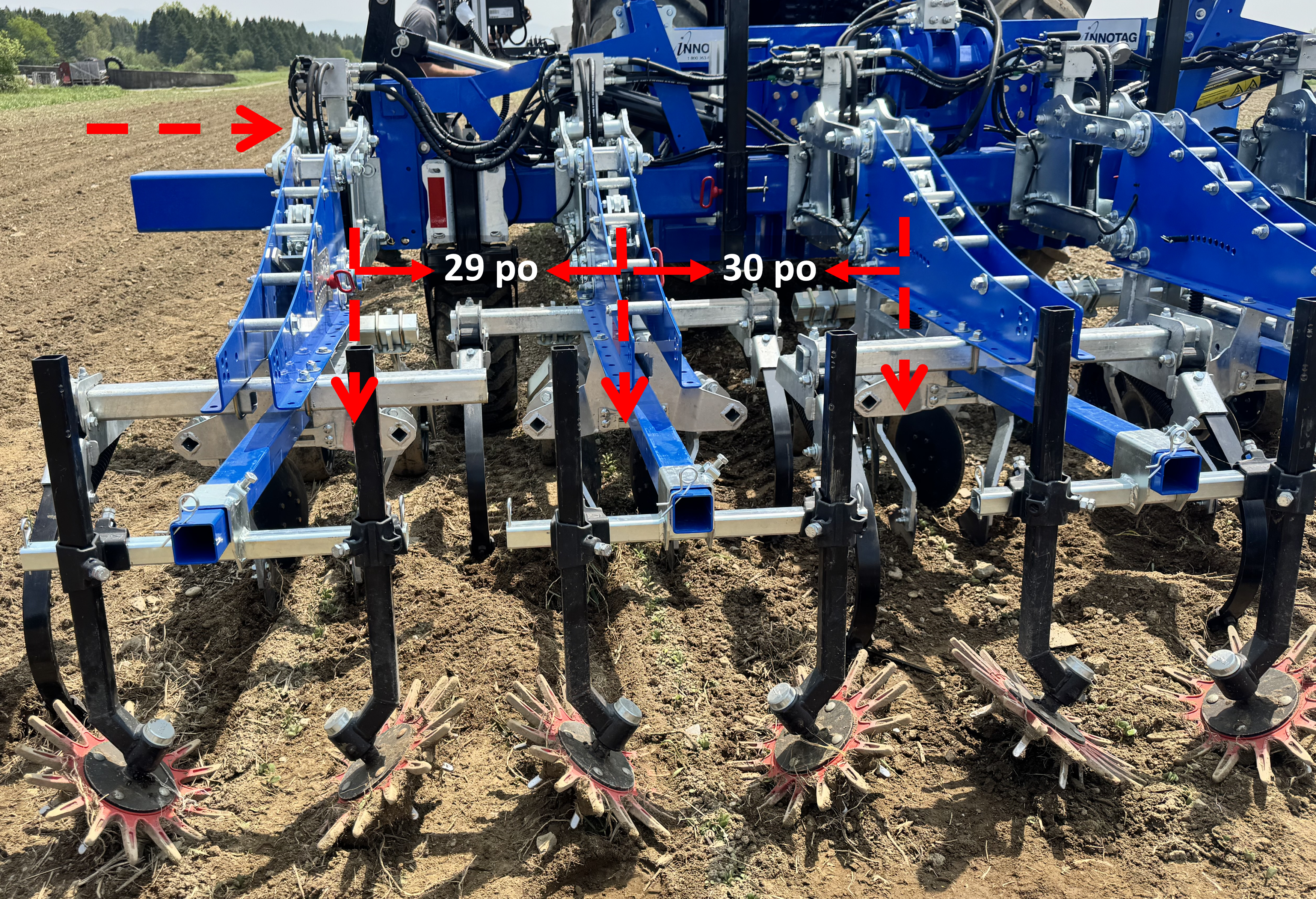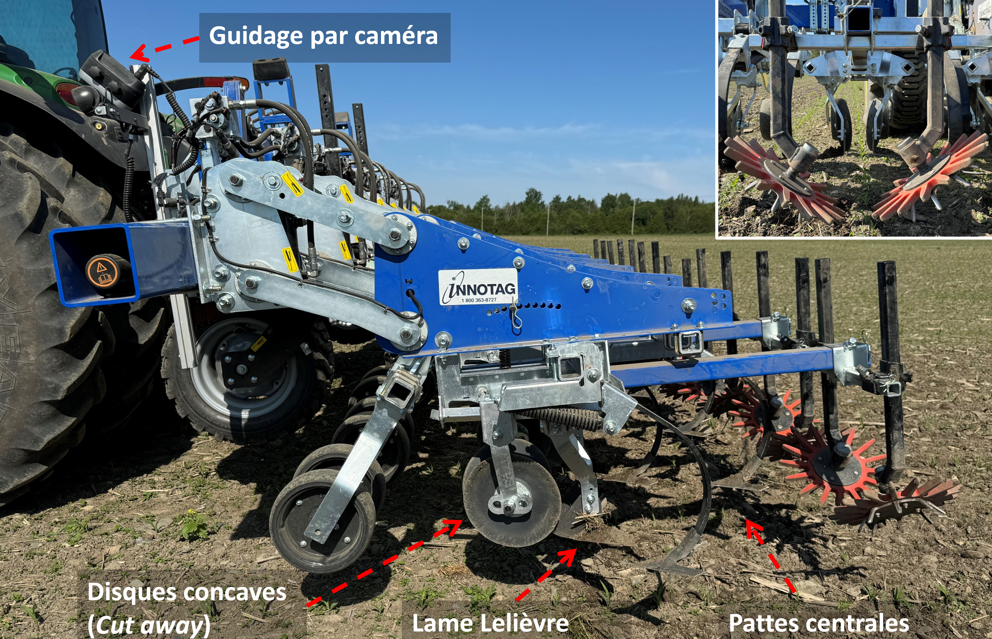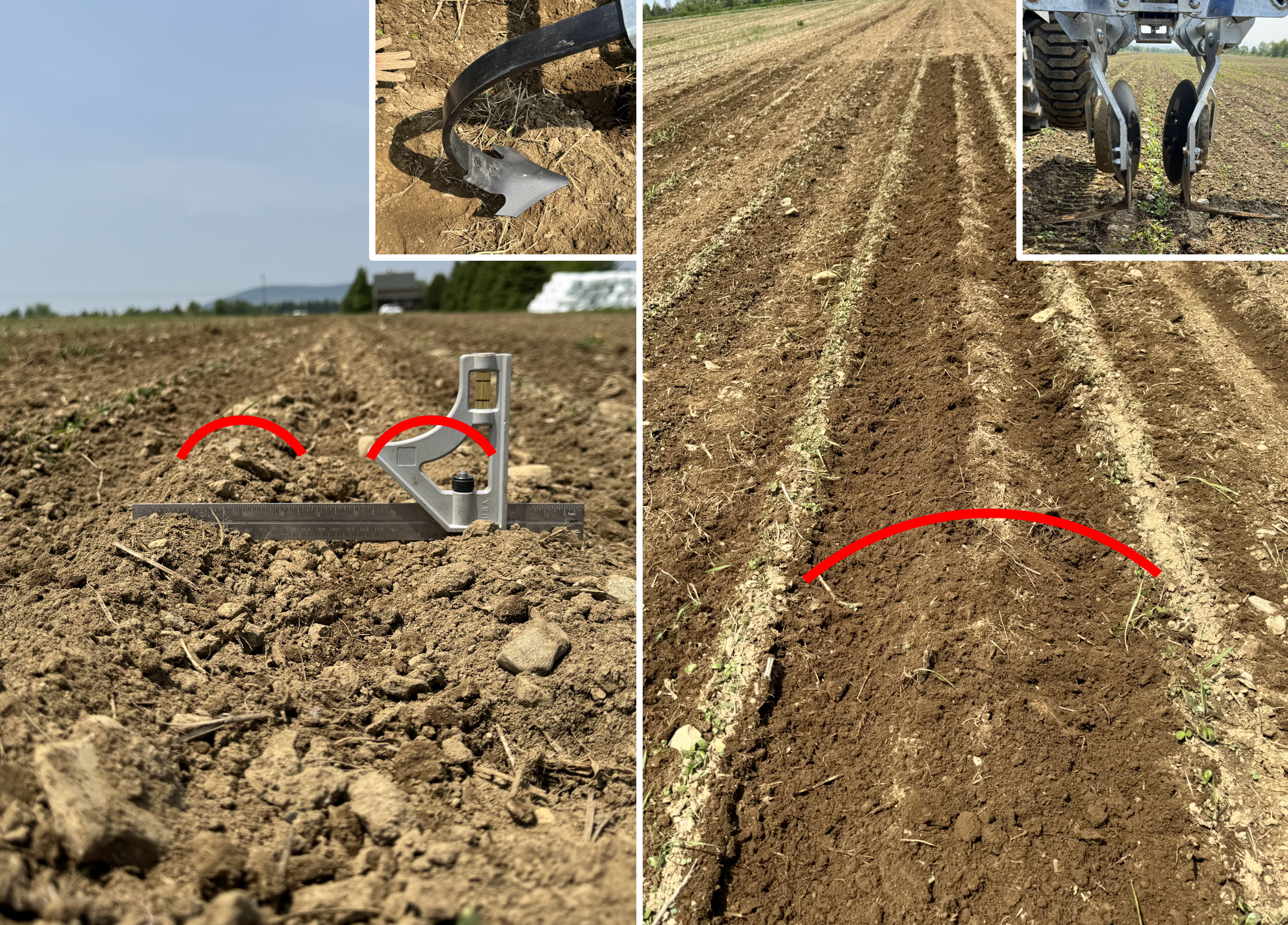 Bulletin n° 24.1, 8 juin 2025 – Désherbage mécanique en grandes cultures Voir tous les bulletins Version PDF imprimable Équipement Bineuse avec lames Lelièvre au stade cotylédons Culture Soya Type de sol Loam limoneux Mise en contexte: Ce bulletin est publié dans le cadre de la mesure 1.8 du Plan national de l’eau, soit « Favoriser l’adoption de méthodes n’utilisant pas de pesticides ». Les exemples sont pris sur des fermes en grandes cultures. À noter que cette publication ne constitue aucunement une recommandation STADE DE LA CULTURE ET DES MAUVAISES HERBES Le soya est au stade émergence des cotylédons (VE). La pression de mauvaises herbes annuelles, en majorité des crucifères, est assez importante. De plus, du chiendent est présent dans certaines zones du champ. La stratégie d’intervention mécanique doit tenir compte des types de mauvaises herbes présentes. Le chiendent peut complexifier l’opération, compte tenu de son important réseau de rhizomes. CHOIX D’ÉQUIPEMENT L’équipement sélectionné pour l’intervention est une bineuse munie de disques concaves (cut away) et de lames Lelièvre. L’objectif est d’intervenir le plus près du soya possible pour déloger les mauvaises herbes annuelles et de couper les rhizomes de chiendent avec les disques concaves. Par la suite, l’action des doigts sarcleurs délogera d’autres adventices, et amènera de la terre à la base des plants de soya. AJUSTEMENT ADAPTÉ DE LA BINEUSE Le premier défi dans l’ajustement a été d’aligner les unités avec le rang. Avant le semis, il est important de s’assurer que l’espace entre les unités du semoir est de 30 po. Ici, la distance était de 29 po pour le rang de gauche. Les ajustements de l’unité de gauche ont dû être adaptés à ce contexte : l’unité a été déplacée sur le porte-outils autant que possible vers la droite, mais le déplacement a été limité par les autres composantes du sarcleur. Quand l’espacement entre les rangs de la culture n’est pas uniforme, il faut adapter l’ajustement au mieux, sans réduire l’efficacité du désherbage effectué par les autres unités du sarcleur. Dans le but de ne pas détruire la culture avec l’unité décentrée, les disques concaves ainsi que la lame Lelièvre de gauche ont été avancés. Cette modification permet de centrer le rang et d’obtenir un ajustement similaire aux autres unités et ainsi avoir un résultat sur le désherbage mécanique satisfaisant. AJUSTEMENT DE LA PATTE CENTRALE ARRIÈRE La conception de ce type de bineuse rend impossible l’ajustement de la hauteur des pattes qui désherbent les inter-rangs de soya. À ce stade précoce du soya, il n’est pas souhaité de couvrir entièrement le soya de terre. Il est important de comprendre le déplacement de la terre avec l’action du sarcleur. Les disques concaves dirigent la terre vers les lames Lelièvre qui, elles, projettent la terre vers la patte centrale arrière (1). Celle-ci retourne la terre vers les doigts sarcleurs (2) qui, eux, dirigent la terre vers le rang de soya. Le volume de terre déplacé sur le rang de soya est influencé par l’écartement des doigts sarcleurs (la quantité de terre augmente en écartant les doigts sarcleurs) et la largeur de la pointe de la patte arrière. La largeur des pointes de la patte arrière (12,5 po de large) est trop importante et celle-ci génère trop de terre vers les doigts sarcleurs, ce qui enterre le rang de soya. Cela empêche de prendre de la vitesse afin de désherber convenablement. Différentes configurations du sarcleur ont été essayées pour améliorer la situation. La pointe de 12,5 po a tout d’abord été remplacée par une pointe de 5,5 po (à gauche), mais le résultat donnait deux petits billons dans l’inter-rang, ce qui aurait nui aux désherbages subséquents. Les pattes centrales ont aussi été enlevées (à droite). Cette configuration n’amenait pas assez de terre aux doigts sarcleurs et, par conséquent, sur le rang de soya. AJUSTEMENTS DE LA BINEUSE La configuration qui a donné le meilleur résultat sur le désherbage mécanique a été celle-ci : – Disques concaves espacés de 3,5 po à l’avant des disques ; – Écartement des lames Lelièvre de 7 po ; – Pointe des doigts sarcleurs espacée de 1,5 po au sol ; – Largeur de la pointe de la patte arrière de 8,5 po. RÉSULTAT DU DÉSERBAGE MÉCANIQUE L’ajustement a permis d’exposer un maximum de mauvaises herbes au stade de fils blancs à la surface du sol. De plus, un léger billon a été créé à la base des rangs de soya, enterrant ainsi les mauvaises herbes non arrachées par le passage de la bineuse. La vitesse d’avancement variait entre 9 et 10 km/h. Liens utiles: Fiche technique du CETAB+ : Séquences de passages Fiche technique du CETAB+: Les sarcleurs léger et mi-lourd Fiche technique du CETAB+: Les doigts sarcleurs Ce bulletin a été rédigé par Murielle Bournival, agronome au CETAB+. La révision linguistique a été réalisée en collaboration de Julie Anne Wilkinson, agronome M.Sc., CETAB+.