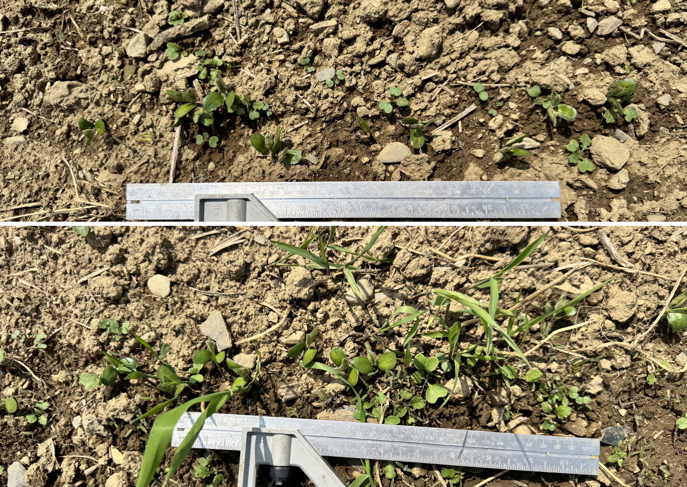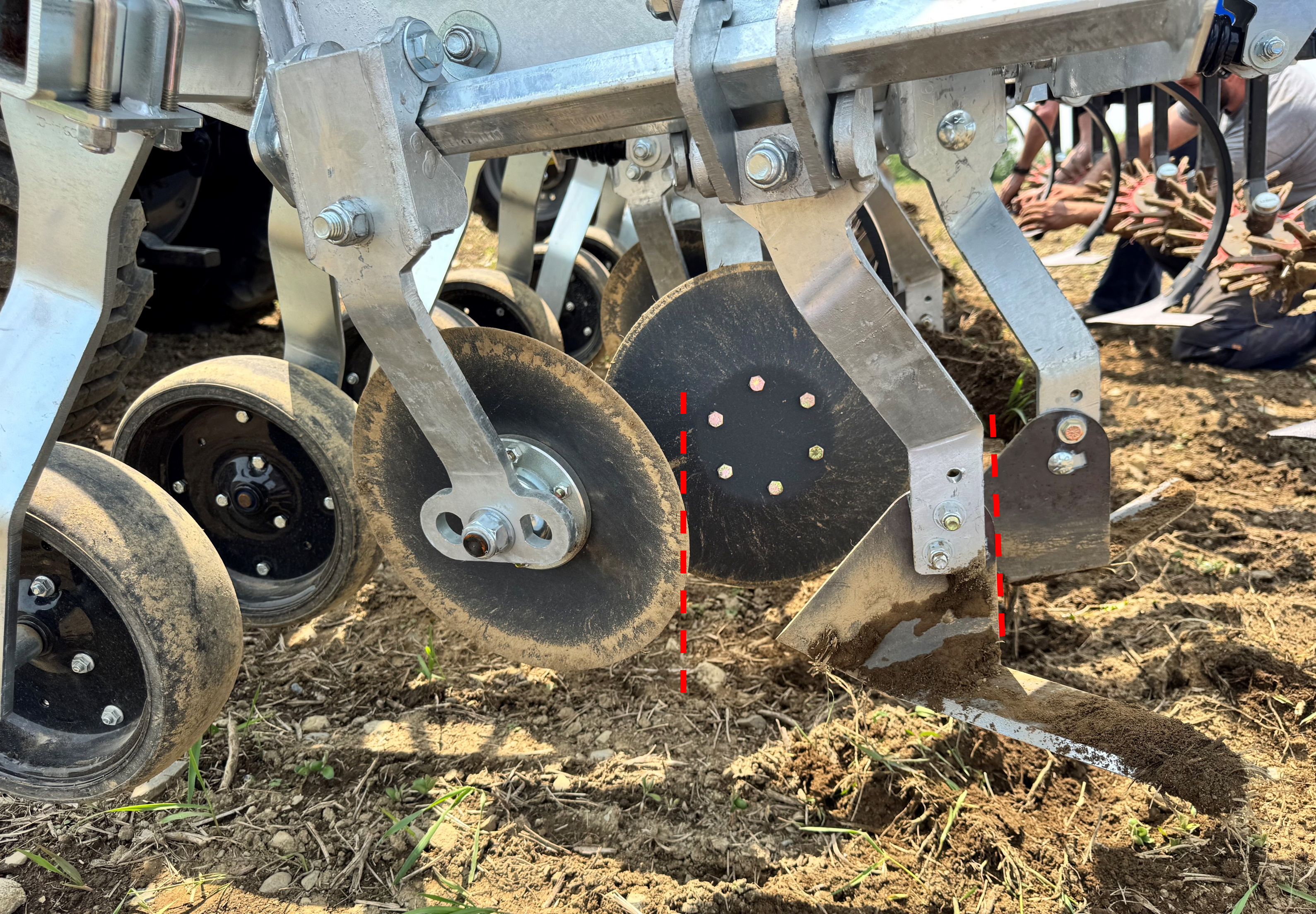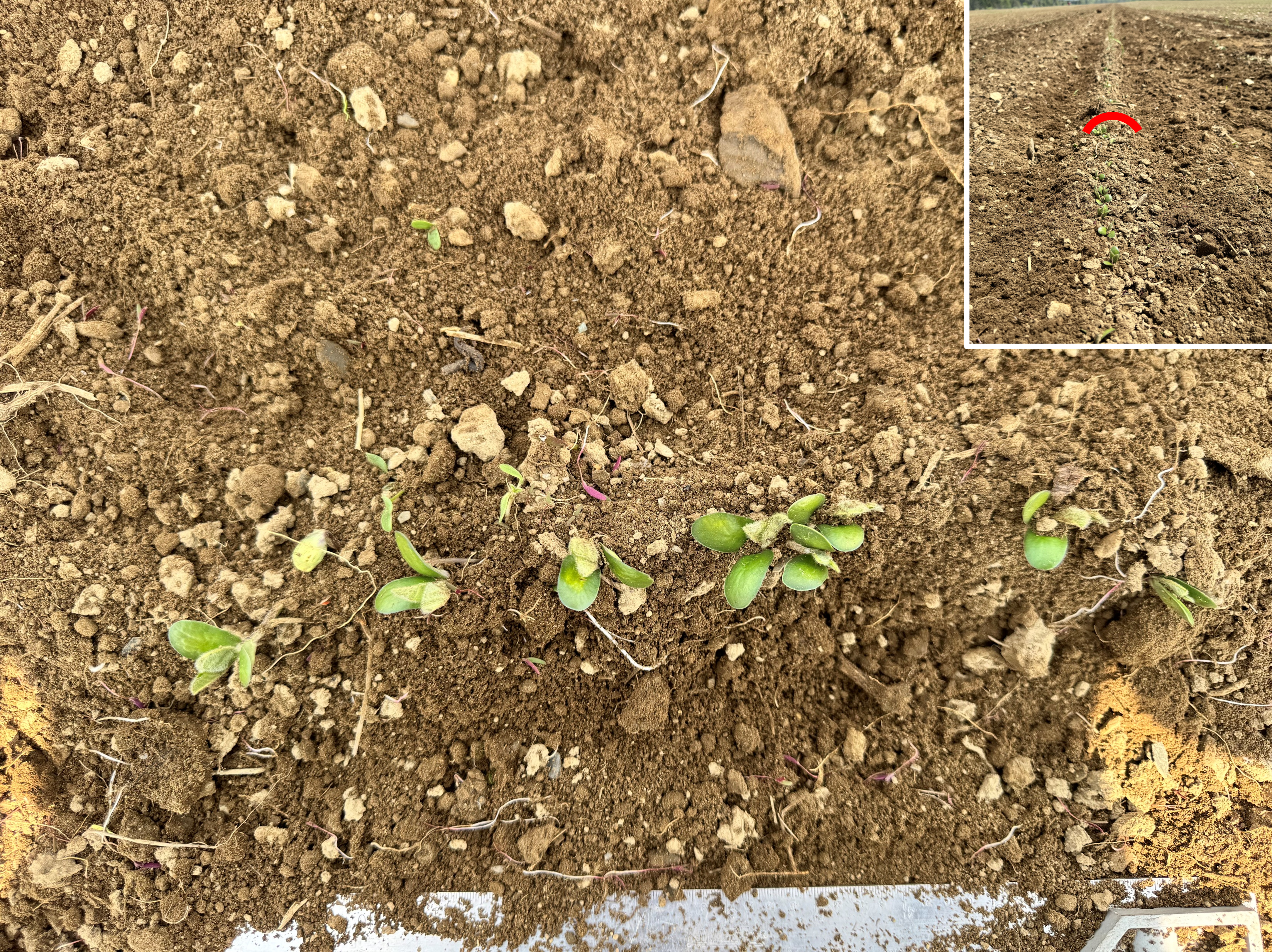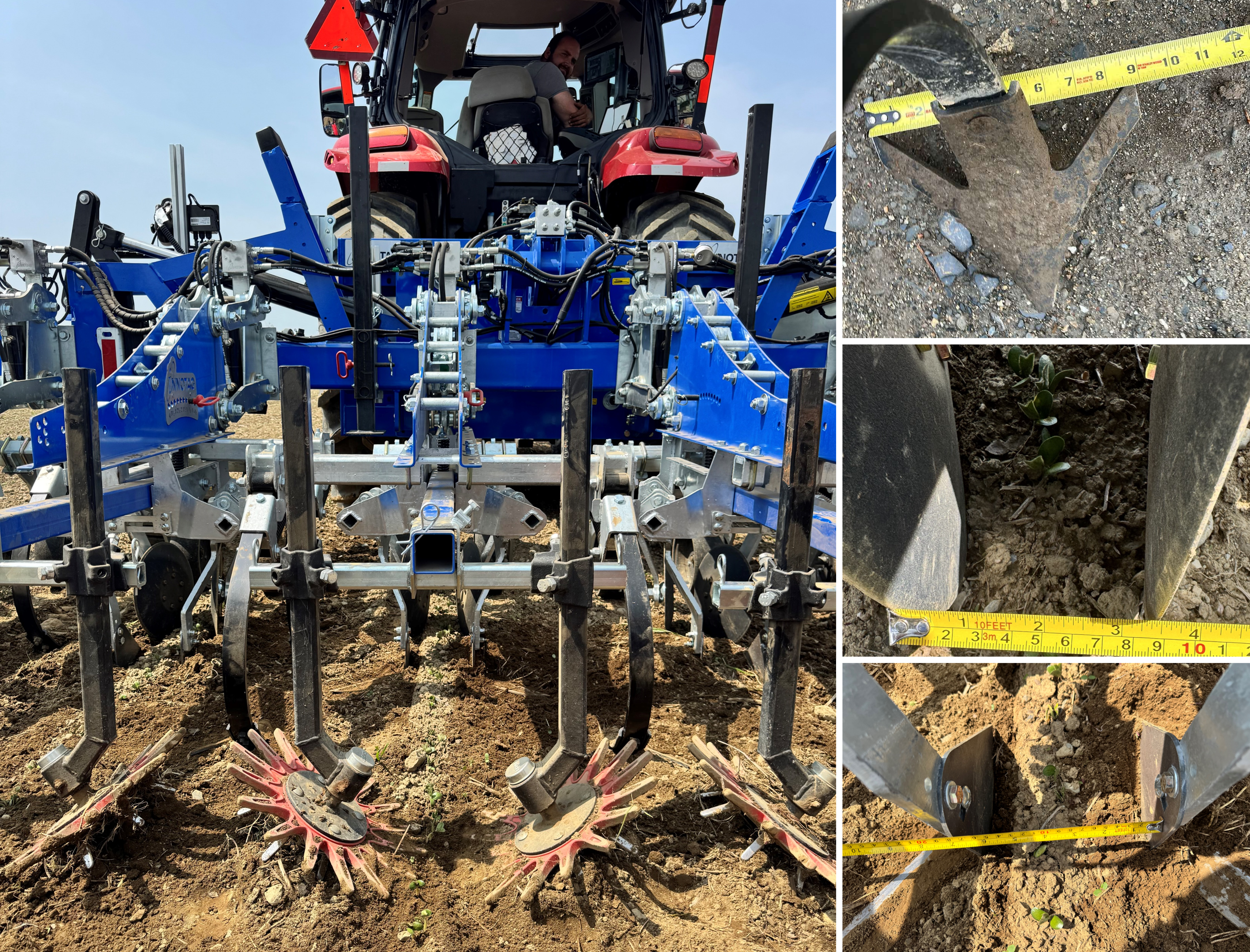 Bulletin n° 24.1, 8 juin 2025 – Désherbage mécanique en grandes cultures Voir tous les bulletins Version PDF imprimable Équipement Bineuse avec lames Lelièvre au stade cotylédons Culture Soya Type de sol Loam limoneux Mise en contexte: Ce bulletin est publié dans le cadre de la mesure 1.8 du Plan national de l’eau, soit « Favoriser l’adoption de méthodes n’utilisant pas de pesticides ». Les exemples sont pris sur des fermes en grandes cultures. À noter que cette publication ne constitue aucunement une recommandation STADE DE LA CULTURE ET DES MAUVAISES HERBES Le soya est au stade émergence des cotylédons (VE). La pression de mauvaises herbes annuelles, en majorité des crucifères, est assez importante. De plus, du chiendent est présent dans certaines zones du champ. La stratégie d’intervention mécanique doit tenir compte des types de mauvaises herbes présentes. Le chiendent peut complexifier l’opération, compte tenu de son important réseau de rhizomes. CHOIX D’ÉQUIPEMENT L’équipement sélectionné pour l’intervention est une bineuse munie de disques concaves (cut away) et de lames Lelièvre. L’objectif est d’intervenir le plus près du soya possible pour déloger les mauvaises herbes annuelles et de couper les rhizomes de chiendent avec les disques concaves. Par la suite, l’action des doigts sarcleurs délogera d’autres adventices, et amènera de la terre à la base des plants de soya. AJUSTEMENT ADAPTÉ DE LA BINEUSE Le premier défi dans l’ajustement a été d’aligner les unités avec le rang. Avant le semis, il est important de s’assurer que l’espace entre les unités du semoir est de 30 po. Ici, la distance était de 29 po pour le rang de gauche. Les ajustements de l’unité de gauche ont dû être adaptés à ce contexte : l’unité a été déplacée sur le porte-outils autant que possible vers la droite, mais le déplacement a été limité par les autres composantes du sarcleur. Quand l’espacement entre les rangs de la culture n’est pas uniforme, il faut adapter l’ajustement au mieux, sans réduire l’efficacité du désherbage effectué par les autres unités du sarcleur. Dans le but de ne pas détruire la culture avec l’unité décentrée, les disques concaves ainsi que la lame Lelièvre de gauche ont été avancés. Cette modification permet de centrer le rang et d’obtenir un ajustement similaire aux autres unités et ainsi avoir un résultat sur le désherbage mécanique satisfaisant. AJUSTEMENT DE LA PATTE CENTRALE ARRIÈRE La conception de ce type de bineuse rend impossible l’ajustement de la hauteur des pattes qui désherbent les inter-rangs de soya. À ce stade précoce du soya, il n’est pas souhaité de couvrir entièrement le soya de terre. Il est important de comprendre le déplacement de la terre avec l’action du sarcleur. Les disques concaves dirigent la terre vers les lames Lelièvre qui, elles, projettent la terre vers la patte centrale arrière (1). Celle-ci retourne la terre vers les doigts sarcleurs (2) qui, eux, dirigent la terre vers le rang de soya. Le volume de terre déplacé sur le rang de soya est influencé par l’écartement des doigts sarcleurs (la quantité de terre augmente en écartant les doigts sarcleurs) et la largeur de la pointe de la patte arrière. La largeur des pointes de la patte arrière (12,5 po de large) est trop importante et celle-ci génère trop de terre vers les doigts sarcleurs, ce qui enterre le rang de soya. Cela empêche de prendre de la vitesse afin de désherber convenablement. Différentes configurations du sarcleur ont été essayées pour améliorer la situation. La pointe de 12,5 po a tout d’abord été remplacée par une pointe de 5,5 po (à gauche), mais le résultat donnait deux petits billons dans l’inter-rang, ce qui aurait nui aux désherbages subséquents. Les pattes centrales ont aussi été enlevées (à droite). Cette configuration n’amenait pas assez de terre aux doigts sarcleurs et, par conséquent, sur le rang de soya. AJUSTEMENTS DE LA BINEUSE La configuration qui a donné le meilleur résultat sur le désherbage mécanique a été celle-ci : – Disques concaves espacés de 3,5 po à l’avant des disques ; – Écartement des lames Lelièvre de 7 po ; – Pointe des doigts sarcleurs espacée de 1,5 po au sol ; – Largeur de la pointe de la patte arrière de 8,5 po. RÉSULTAT DU DÉSERBAGE MÉCANIQUE L’ajustement a permis d’exposer un maximum de mauvaises herbes au stade de fils blancs à la surface du sol. De plus, un léger billon a été créé à la base des rangs de soya, enterrant ainsi les mauvaises herbes non arrachées par le passage de la bineuse. La vitesse d’avancement variait entre 9 et 10 km/h. Liens utiles: Fiche technique du CETAB+ : Séquences de passages Fiche technique du CETAB+: Les sarcleurs léger et mi-lourd Fiche technique du CETAB+: Les doigts sarcleurs Ce bulletin a été rédigé par Murielle Bournival, agronome au CETAB+. La révision linguistique a été réalisée en collaboration de Julie Anne Wilkinson, agronome M.Sc., CETAB+.