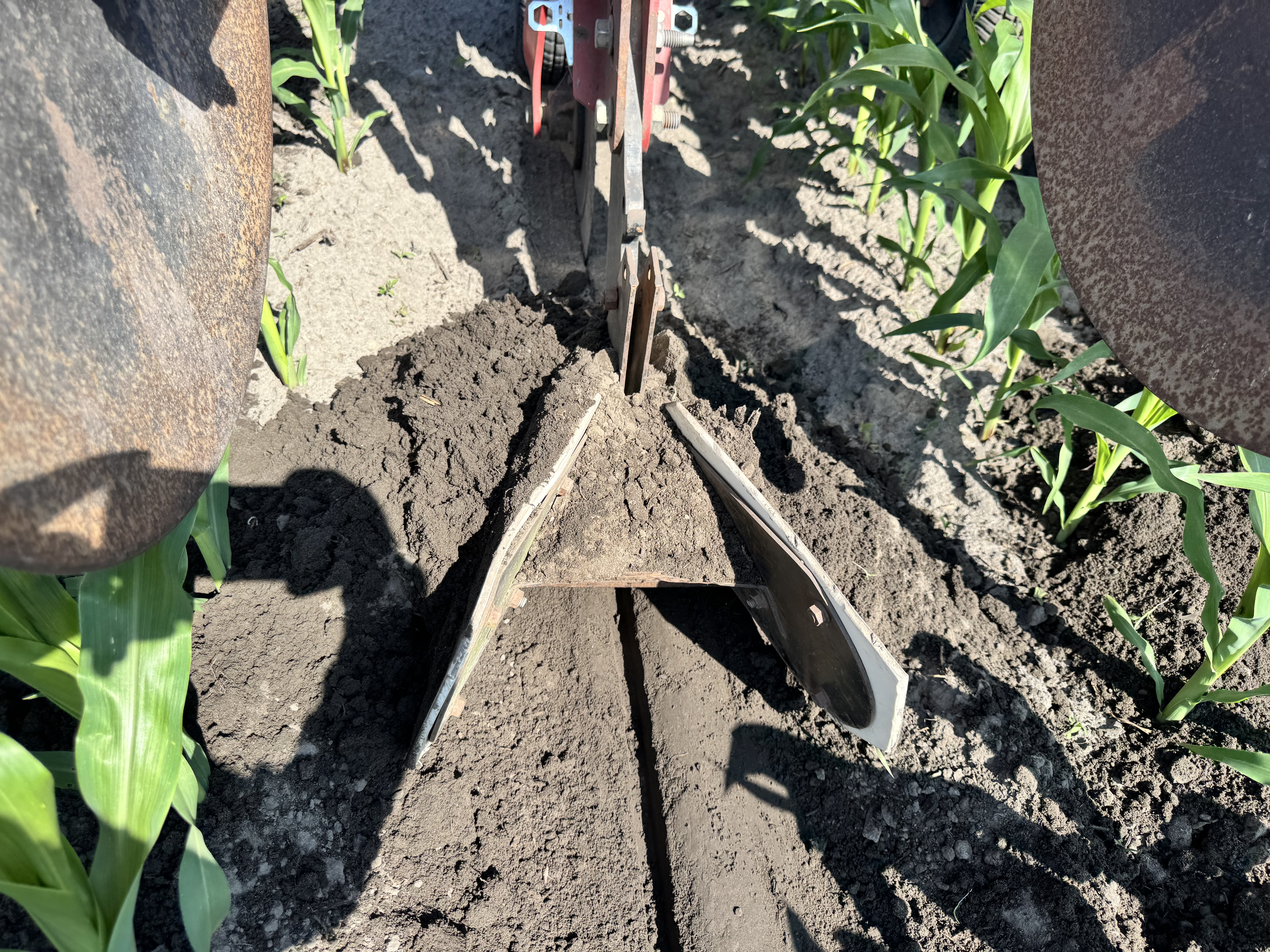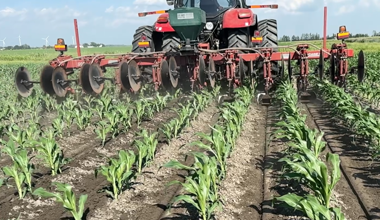 Bulletin n° 27.2, 29 juin 2025 – Désherbage mécanique en grandes cultures Voir tous les bulletins Version PDF imprimable Équipement Sarcleur lourd avec ailes billonneuses au stade V5 Culture Maïs-grain Type de sol Loam sableux Mise en contexte: Ce bulletin est publié dans le cadre de la mesure 1.8 du Plan national de l’eau, soit « Favoriser l’adoption de méthodes n’utilisant pas de pesticides ». Les exemples sont pris sur des fermes en grandes cultures. À noter que cette publication ne constitue aucunement une recommandation STADE DE LA CULTURE ET DES MAUVAISES HERBES Le maïs est au stade V5 et il y a une légère pression de mauvaises herbes sur le rang qui n’ont pas été contrôlées lors des passages précédents. L’objectif de l’intervention est de les enterrer. CHOIX D’ÉQUIPEMENT L’équipement sélectionné pour enterrer les mauvaises herbes sur le rang est un sarcleur lourd muni d’ailes permettant d’effectuer de gros billons à la base des plants de maïs. AJUSTEMENT DES AILES BILLONNEUSES Les ailes billonneuses sont ajustées à 15 po de large, ce qui est suffisant pour déporter la terre vers les rangs de maïs afin de créer des billons. Les ailes sont recouvertes d’une pellicule de téflon qui permet à la terre de mieux circuler. RÉSULTAT DU DÉSERBAGE MÉCANIQUE La hauteur des billons créés par les ailes billonneuse est de 4 po, ce qui est suffisamment haut pour enterrer la majorité des adventices. La vitesse d’avancement était de 7,5 km/h. Liens utiles: Fiche technique du CETAB+ : Séquences de passages Fiche technique du CETAB+: Le sarcleur lourd Ce bulletin a été rédigé par Murielle Bournival, agronome au CETAB+. La révision linguistique a été réalisée en collaboration de Julie Anne Wilkinson, agronome M.Sc., CETAB+.
