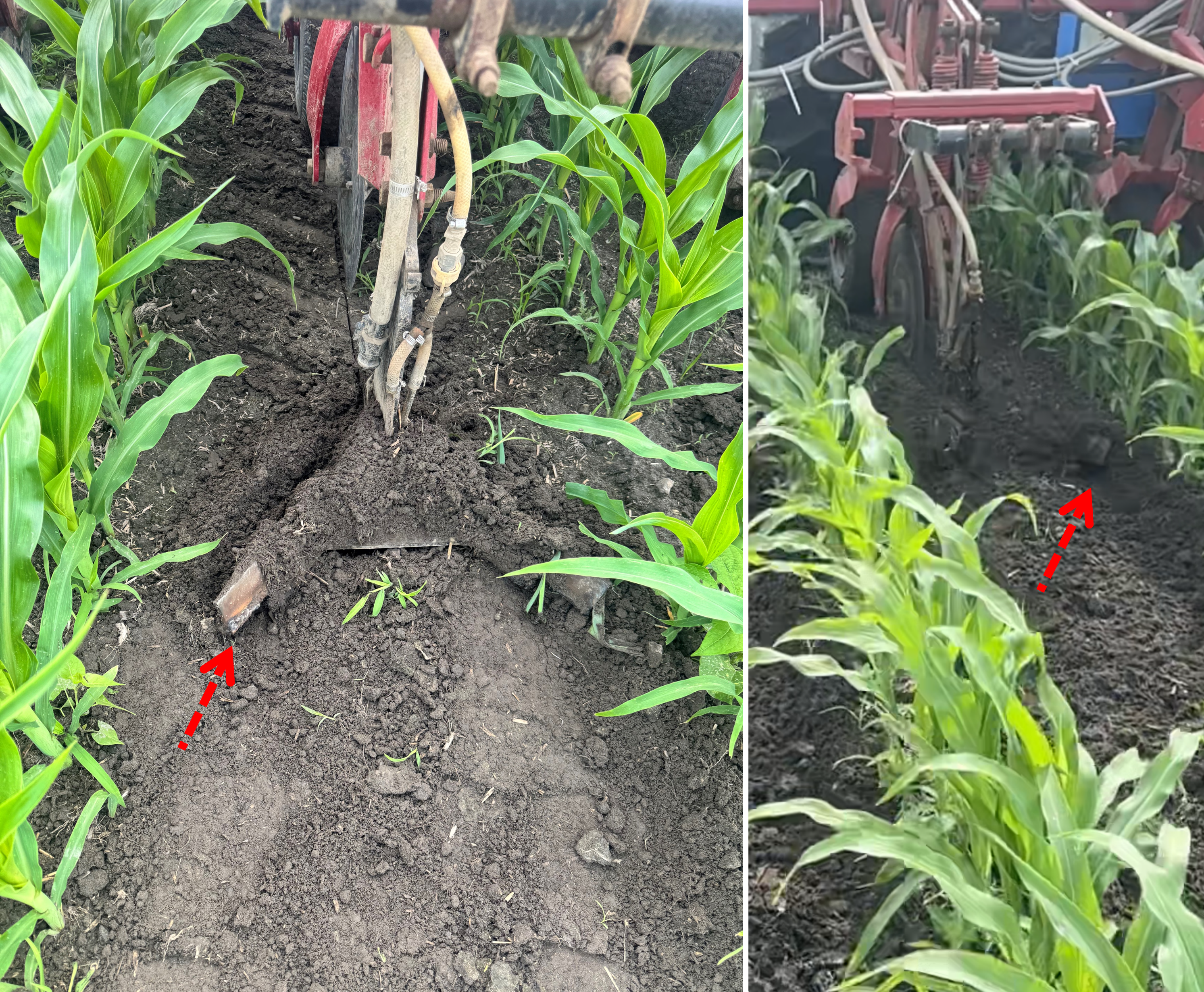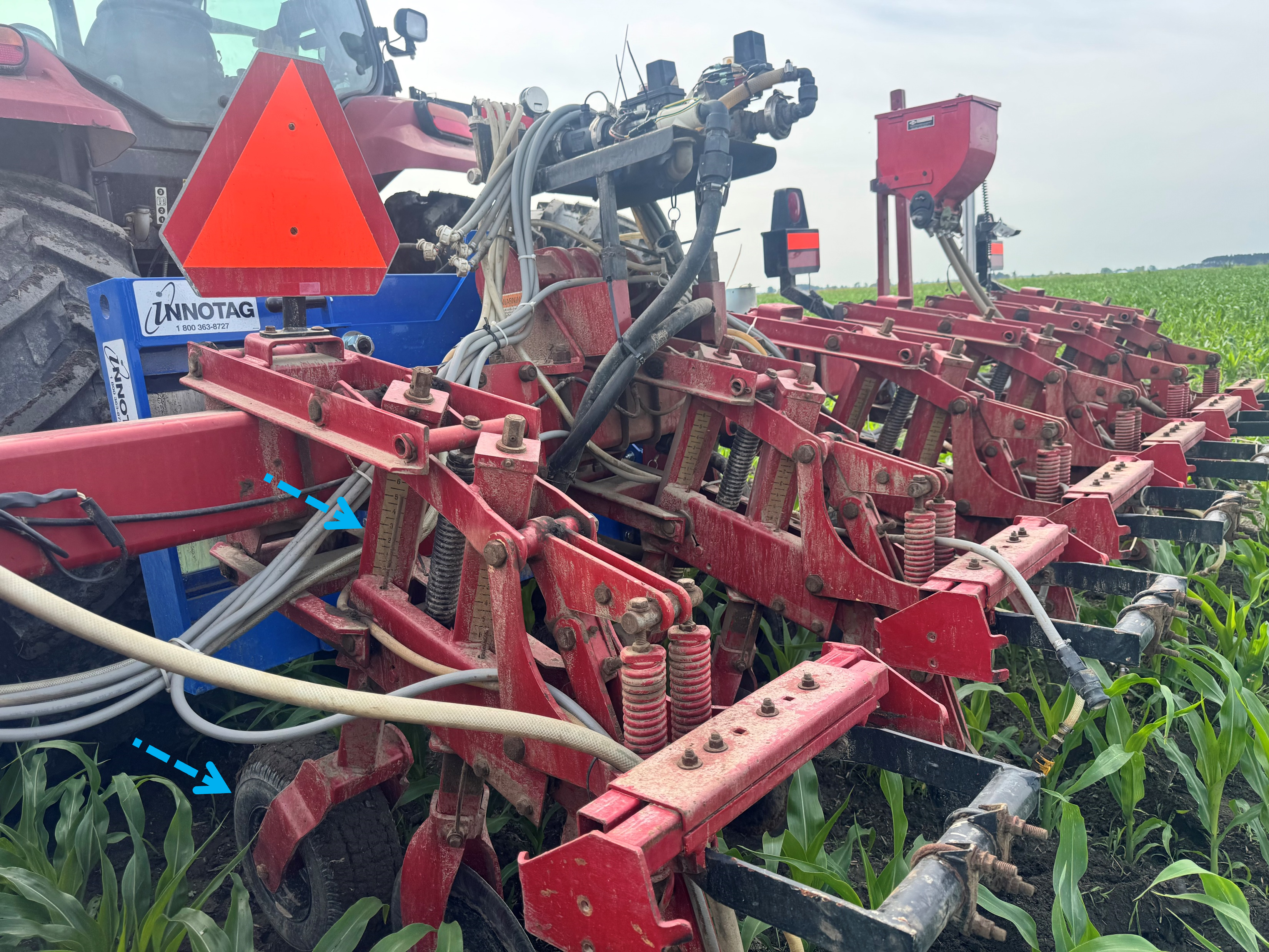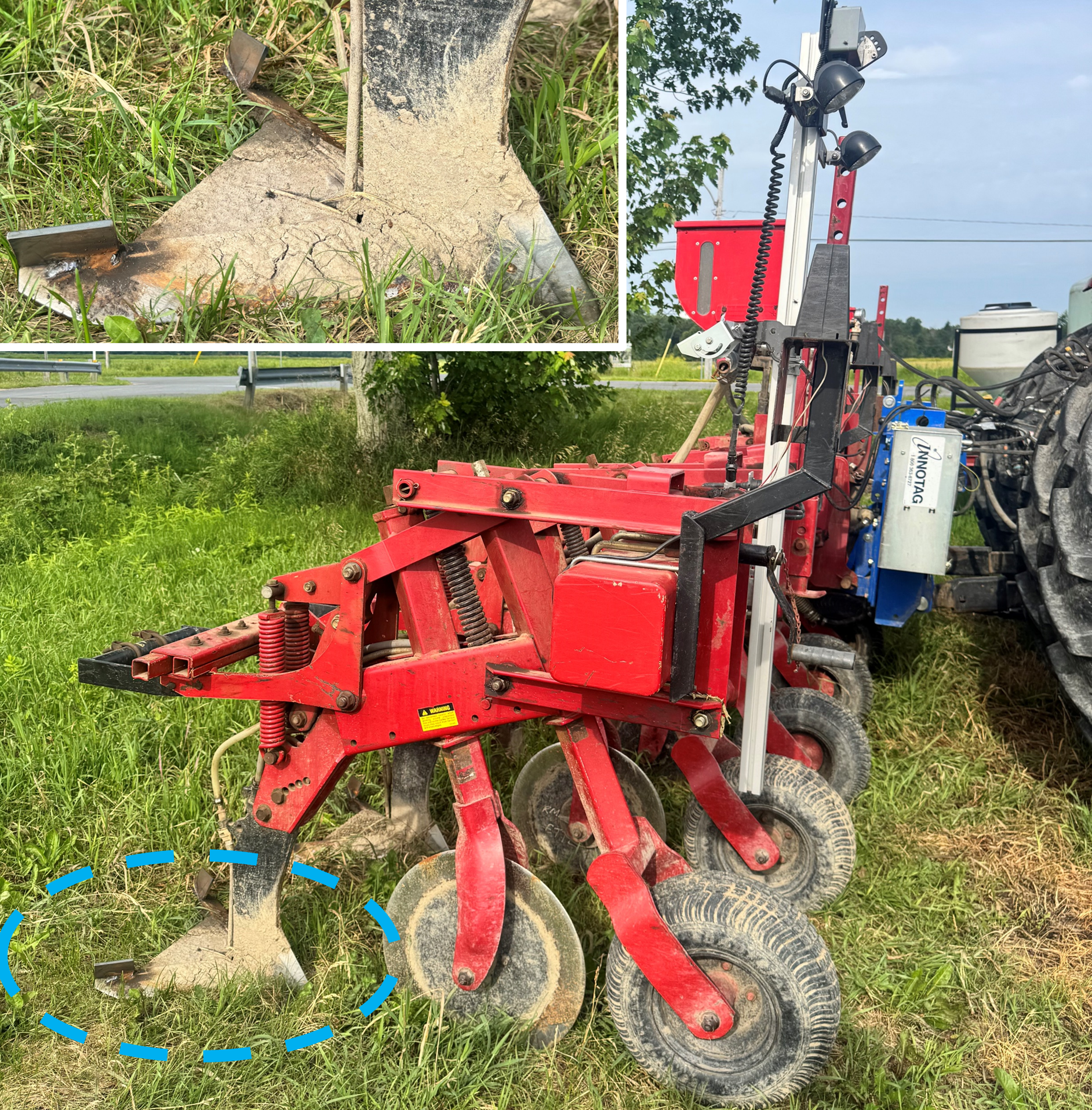 Bulletin n° 28.1, 6 juillet 2025 – Désherbage mécanique en grandes cultures Voir tous les bulletins Version PDF imprimable Équipement Sarcleur lourd au stade V6 Culture Maïs-grain Type de sol Loam sableux Mise en contexte: Ce bulletin est publié dans le cadre de la mesure 1.8 du Plan national de l’eau, soit « Favoriser l’adoption de méthodes n’utilisant pas de pesticides ». Les exemples sont pris sur des fermes en grandes cultures. À noter que cette publication ne constitue aucunement une recommandation STADE DE LA CULTURE ET DES MAUVAISES HERBES Le maïs-grain est au stade V6. Il reste quelques mauvaises herbes annuelles à la base des plants, essentiellement du chénopode et des graminées annuelles. Il s’agit de la dernière intervention avant que la canopée du maïs soit trop importante et empêche le désherbage mécanique. PROFONDEUR D’ENRACINEMENT Avec les pluies abondantes, l’enracinement du maïs est superficiel. Il est important d’aller vérifier leur profondeur afin d’adapter la profondeur du désherbage mécanique. Dans ce champ, des racines étaient présentes jusqu’à 1 po de profondeur. CHOIX D’ÉQUIPEMENT L’équipement utilisé pour l’intervention est un sarcleur lourd muni d’un système de guidage par caméra. Chaque unité possède un disque central qui ouvre un sillon qui facilite la pénétration du sol de l’unité avec les couteaux. PLAQUES SOUDÉES À LA POINTE DES COUTEAUX La largeur des couteaux est de 17 po. Il s’agit de la largeur utilisée communément pour la dernière intervention de désherbage mécanique afin de ne pas endommager le système racinaire. Comme ce sarcleur ne disposait pas d’ailes billonneuses, des plaques de métal (3 po de large sur 2 po de haut) ont été soudées sur la pointe des couteaux afin d’augmenter le déplacement de la terre et créer des billons servant à enterrer les mauvaises herbes à la base des plants de maïs-grain. AJUSTEMENTS DU SARCLEUR LOURD Plusieurs réglages ont été effectués pour ajuster le sarcleur lourd : – Les roues de profondeur ont été relevées afin de favoriser la pénétration des unités. – La hauteur des disques a été positionnée plus basse que les unités pour favoriser la pénétration dans le sol. – La vitesse d’avancement était de 11 km/h. – Le troisième point a été raccourci légèrement pour créer un angle afin que la pointe des couteaux soit moins profonde que le centre. Cet angle favorise le déplacement de terre latéralement. – La profondeur de travail au centre de l’inter-rang est environ de 1 po, alors qu’à la pointe elle n’excède pas ½ po pour ne pas endommager le système racinaire des plants de maïs. RÉSULTAT DU DÉSERBAGE MÉCANIQUE L’intervention de désherbage mécanique n’a pas affecté le système racinaire du maïs. Cette photo a été prise au même endroit que celle du premier encadré. Le billon créé par les plaques de métal soudées aux couteaux a été suffisant pour enterrer les chénopodes et les autres mauvaises herbes sur le rang. Les mauvaises herbes présentes dans les inter-rangs ont également été coupées par le passage des couteaux. Liens utiles: Fiche technique du CETAB+ : Séquences de passages Fiche technique du CETAB+: Le sarcleur lourd Ce bulletin a été rédigé par Murielle Bournival, agronome au CETAB+. La révision linguistique a été réalisée en collaboration de Julie Anne Wilkinson, agronome M.Sc., CETAB+.