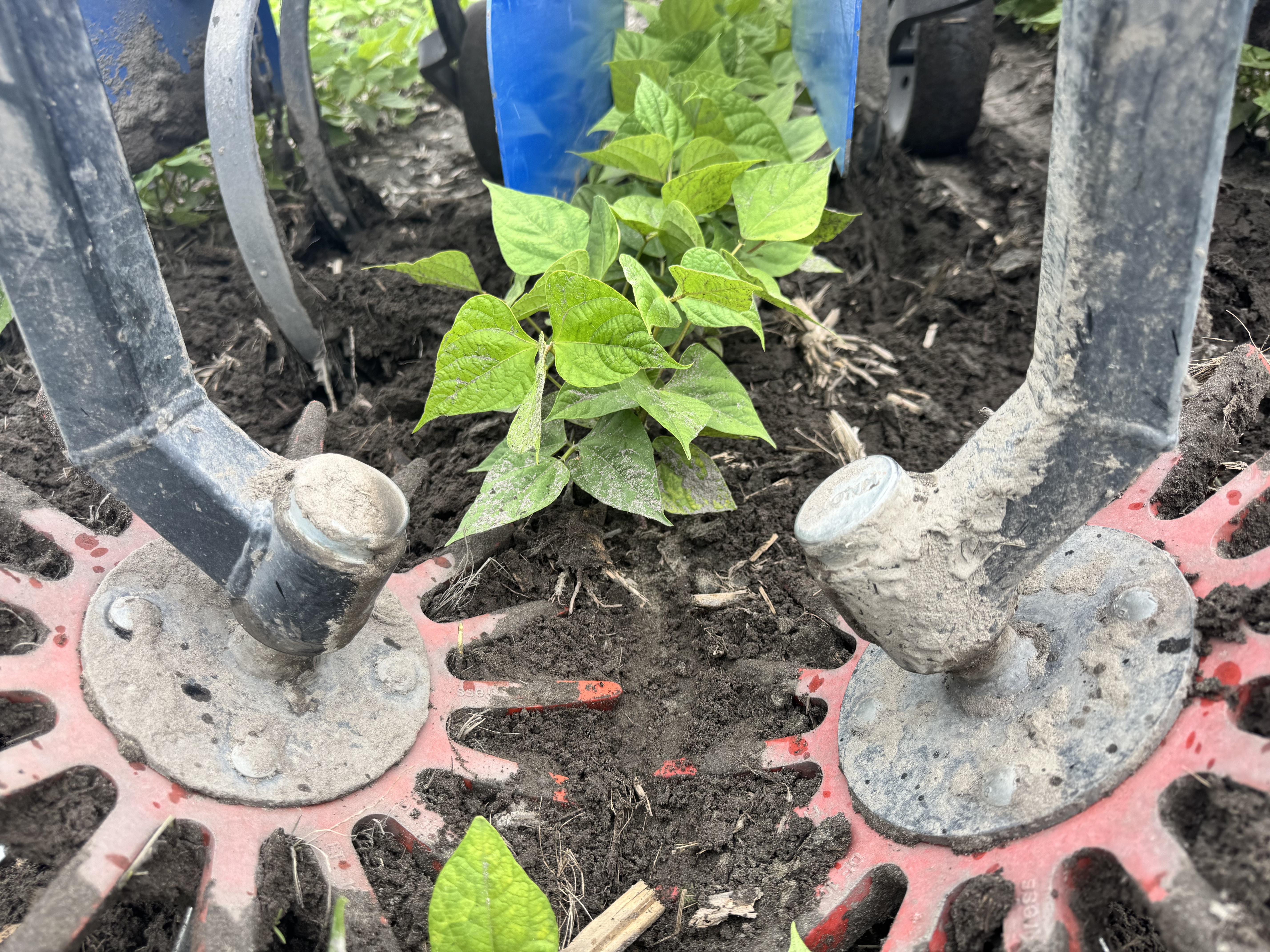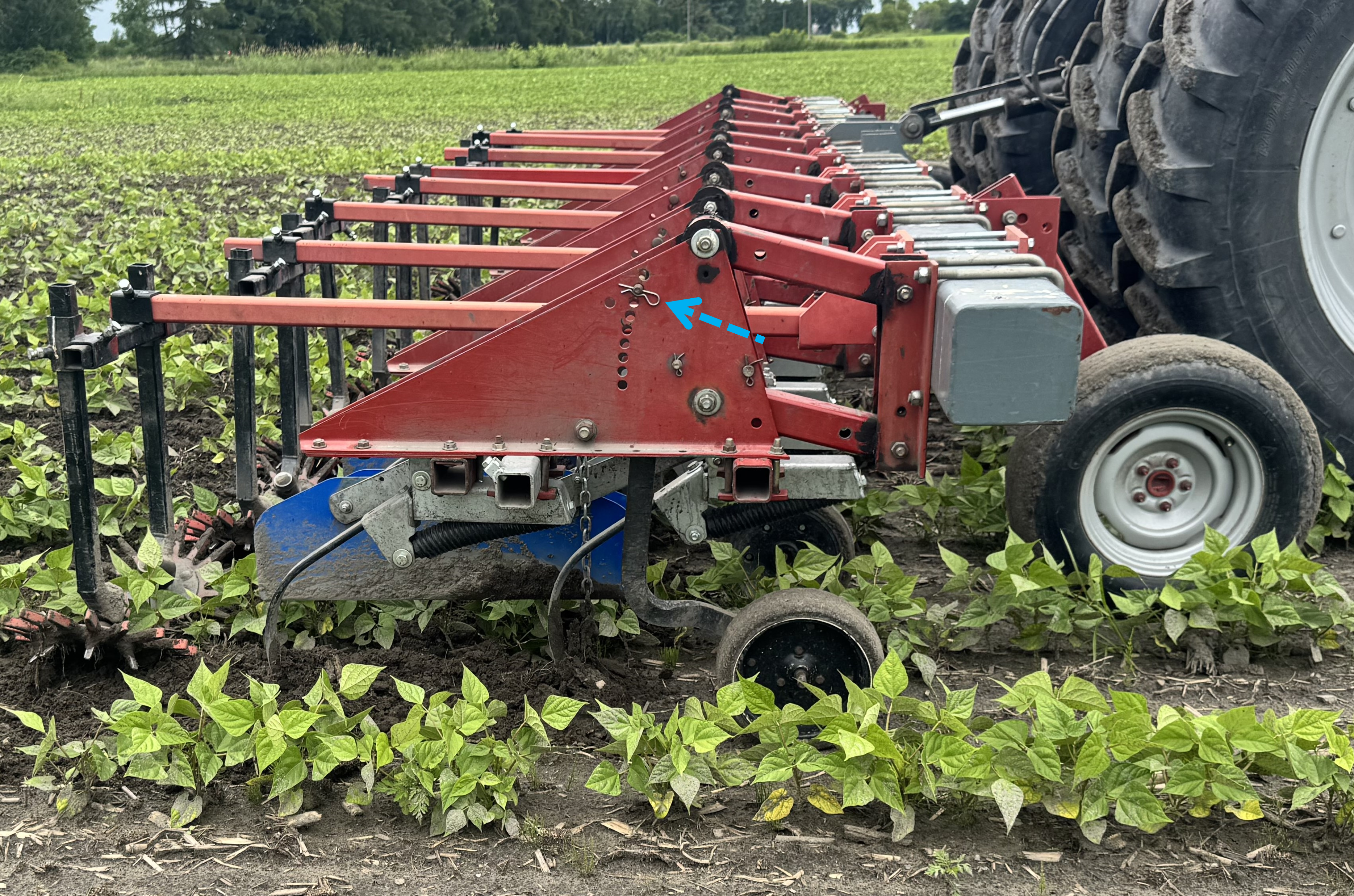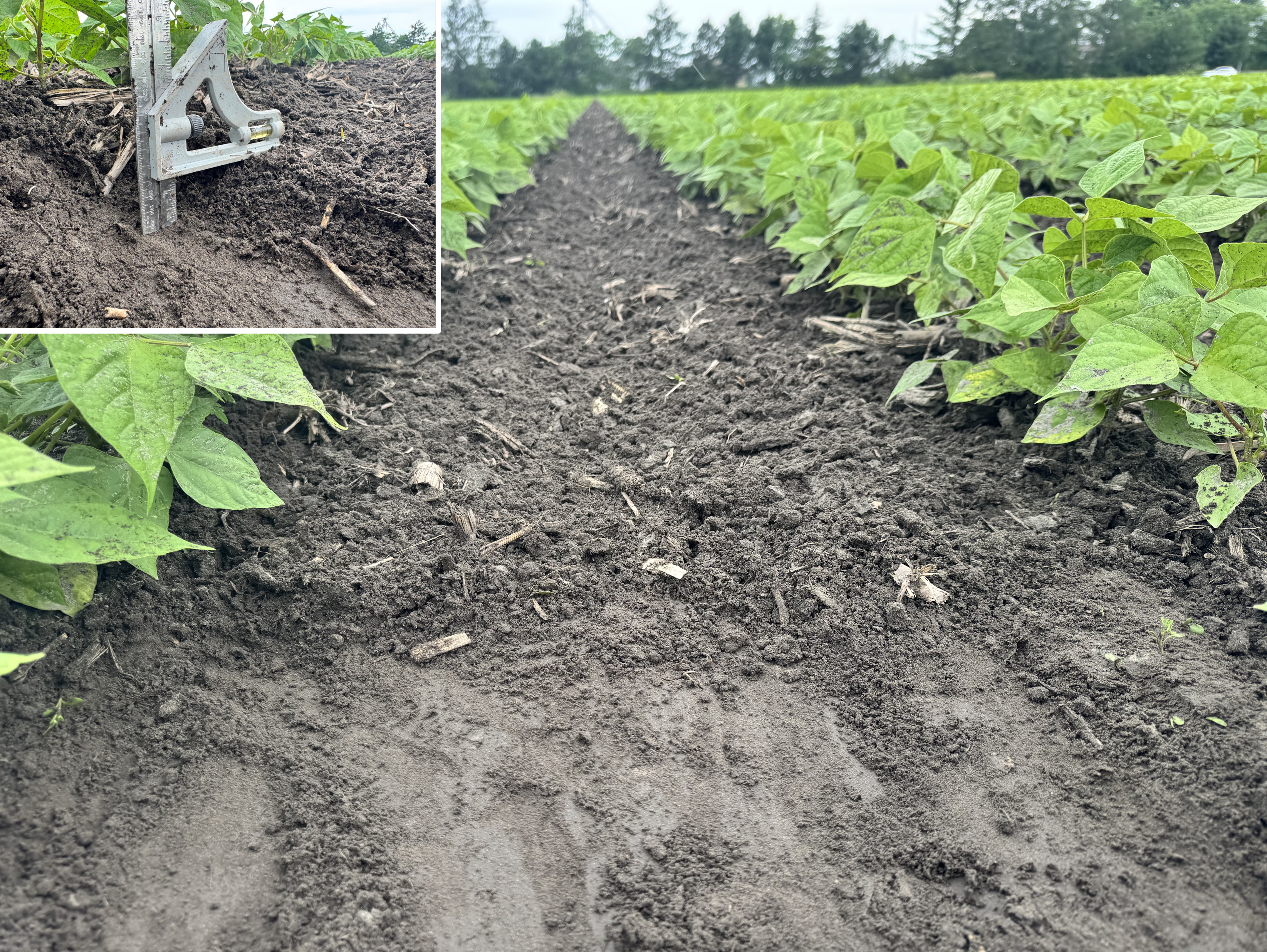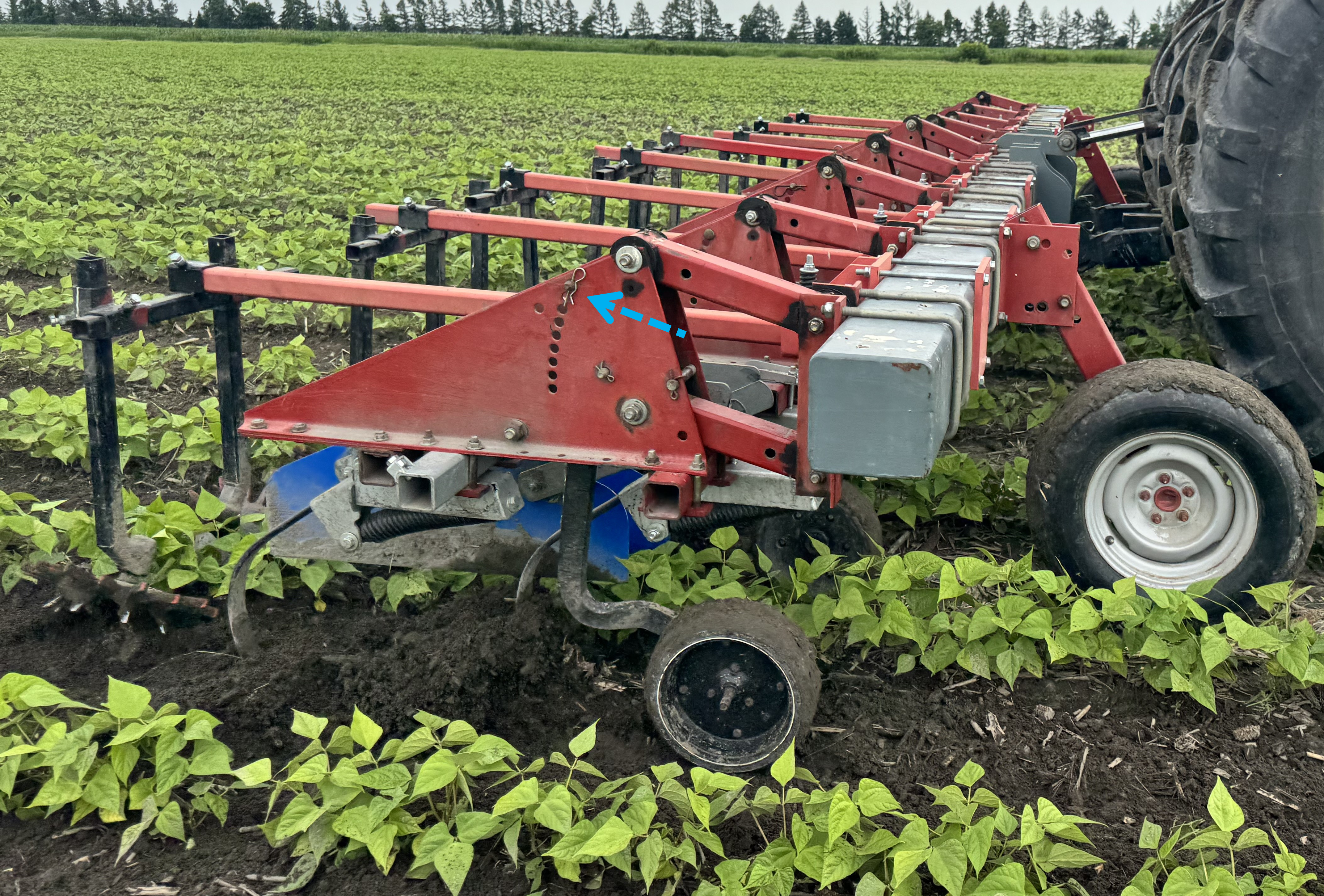 Bulletin n° 28.2, 6 juillet 2025 – Désherbage mécanique en grandes cultures Voir tous les bulletins Version PDF imprimable Équipement Sarcleur mi-lourd avec doigts sarcleurs Culture Haricot sec Type de sol Loam sableux Mise en contexte: Ce bulletin est publié dans le cadre de la mesure 1.8 du Plan national de l’eau, soit « Favoriser l’adoption de méthodes n’utilisant pas de pesticides ». Les exemples sont pris sur des fermes en grandes cultures. À noter que cette publication ne constitue aucunement une recommandation STADE DE LA CULTURE ET DES MAUVAISES HERBES Les haricots secs sont au stade 5 à 6 trifoliées. Des jeunes mauvaises herbes annuelles à feuille large sont présentes autant à la base des plants que dans les entre-rangs. Une intervention est nécessaire pour éliminer des adventices avant la pluie imminente. PROFONDEUR D’ENRACINEMENT L’enracinement des haricots est très superficiel. Des racines sont présentes très près de la surface à environ 0,5 po de profondeur. La stratégie de désherbage doit en tenir compte. AJUSTEMENTS DU SARCLEUR MI-LOURD L’équipement utilisé pour le désherbage est un sarcleur mi-lourd avec trois pattes munies de pointes de 9 po ainsi que de doigts sarcleurs. Les plaques de protection sont relevées au maximum pour permettre à la terre de se diriger à la base des plants de haricot. Le premier ajustement du sarcleur, bien qu’il soit adéquat pour la gestion des adventices, était trop profond et affectait le système racinaire des haricots. Les deux pattes latérales étaient à une profondeur d’environ 2 po, alors que la profondeur de travail de la patte arrière était d’environ 1 po. Les roues de profondeur ont été descendues afin de faire remonter le travail des pattes près de la surface du sol et éviter d’abîmer le système racinaire des haricots. L’ajustement des roues de profondeur a permis aux pattes de travailler à moins de 1 po de la surface du sol. La vitesse d’avancement était de 9 km/h. Les doigts sarcleurs ont été ajustés de façon que les pointes se touchent une fois au sol. Cet ajustement permet de venir extirper les petites mauvaises herbes à la base des plants de haricots secs. RÉSULTAT DU DÉSERBAGE MÉCANIQUE L’ajustement du sarcleur mi-lourd a permis de faire un désherbage adéquat autant sur le rang que dans l’entre-rang, et ce, sans abîmer le système racinaire des haricots secs. Liens utiles: Fiche technique du CETAB+ : Séquences de passages Fiche technique du CETAB+: Les sarcleurs léger et mi-lourd Fiche technique du CETAB+: Les doigts sarcleurs Ce bulletin a été rédigé par Murielle Bournival, agronome au CETAB+. La révision linguistique a été réalisée en collaboration de Julie Anne Wilkinson, agronome M.Sc., CETAB+.